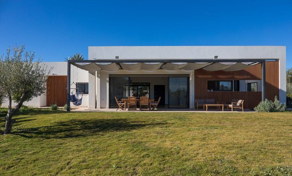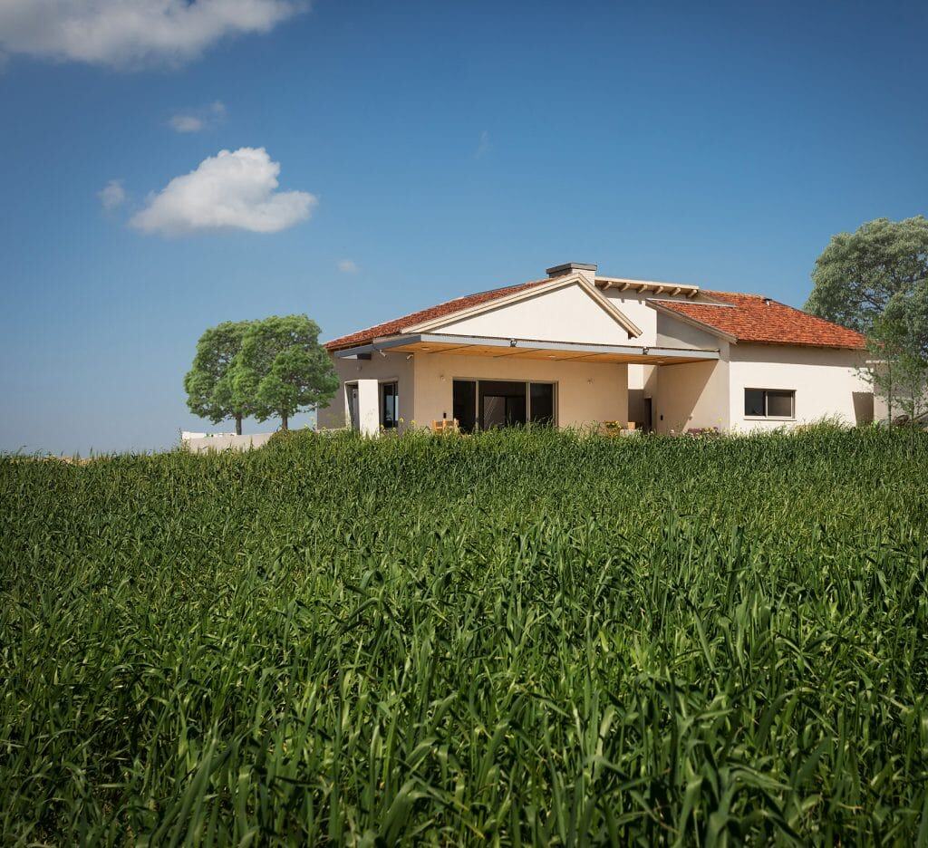 בית לבן עם פרופורציות אופקיות, ניצב בלב שדות חיטה וטבע בתולי אינסופי . הבית מפנה את המרחב הציבורי וסוויטת ההורים אל השדות. השפה מייצרת תחושה של חופש ושלווה ושל מקום שנעים לחזור אליו בסוף יום . לחזור לנחלה.