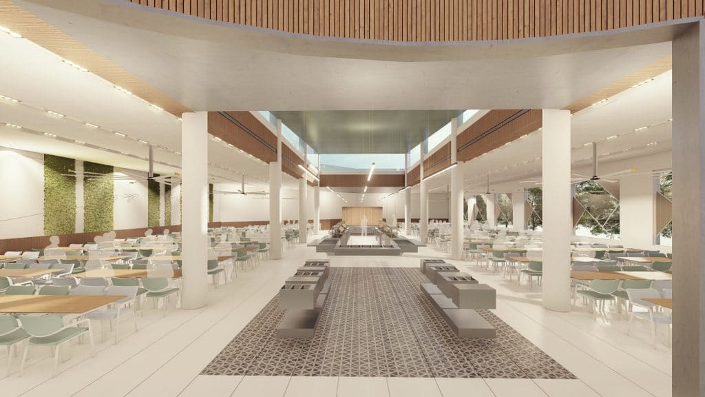 מכלול הסעדה המאגד מטבח תעשייתי עם ארבע אולמות חדרי אוכל . חדרי האוכל פונים אל חצרות פנימיות ומוארים על ידי אור טבעי אשר חודר מזיגוג התקרה . תגמירי הפנים טבעיים : חיפויי עץ וקירות ירוקים חיים . חומרי הגמר החיצוניים : אבן טבעית ופח נחושת .