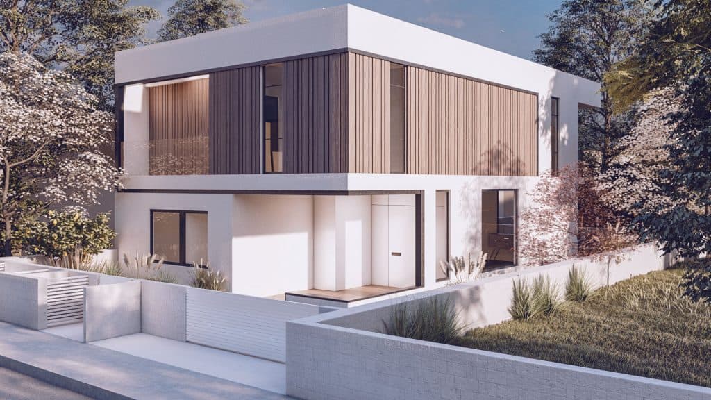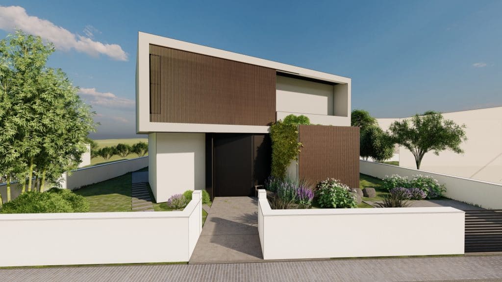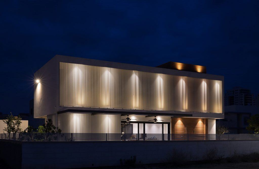 משחק עדין בין 2 מנסרות מייצר מבואת כניסה עמוקה ומזמינה . הקומה העליונה חופתה בלוחות עץ בגדלים ובקצב שונה, תוך טשטוש מערכת הזיגוג של חדרי השינה . קומת המסד בטיח לבן, מחדירה כמות אור טבעי דרך מפתחים רחבים אל החלל הציבורי . הבית משדר חזית אטומה לחזית הרחוב, אך מחורר ומאוורר להפליא.