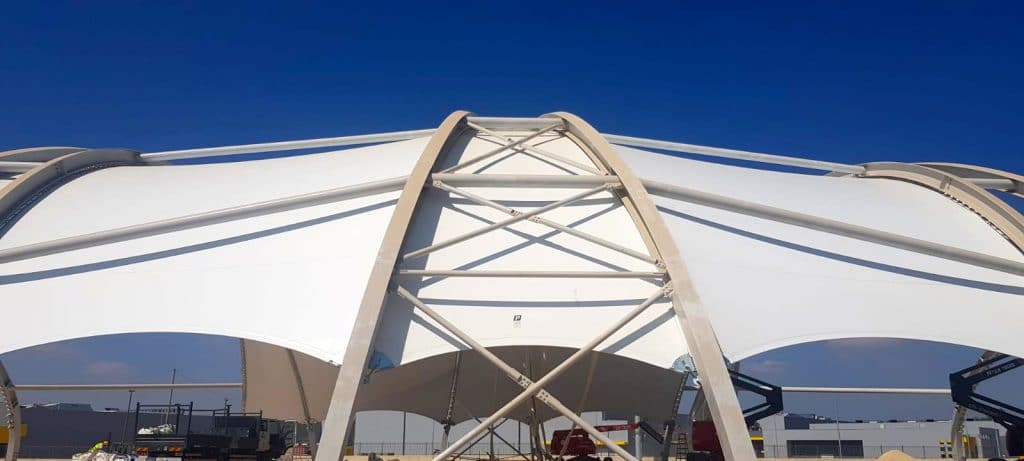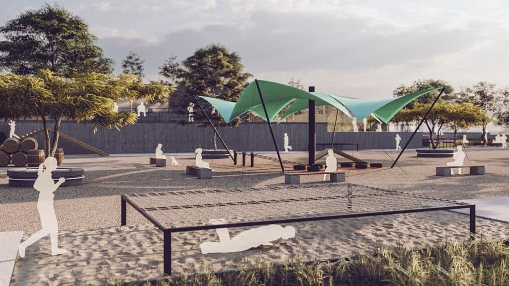 מערכת קירוי קלה המבוססת על שדות קורות פלדה מעורגלות המתוחות זו לזו באמצעות מערכות ממברנה פרבוליות. המערכת מקרה מתחם אימוני כושר ומאפשרת כיסוי צל מלא בכל שעות היממה. מערכת הממברנה שנבחרה מבטיחה את רצף התפקוד גם בימי גשם ורוחות.