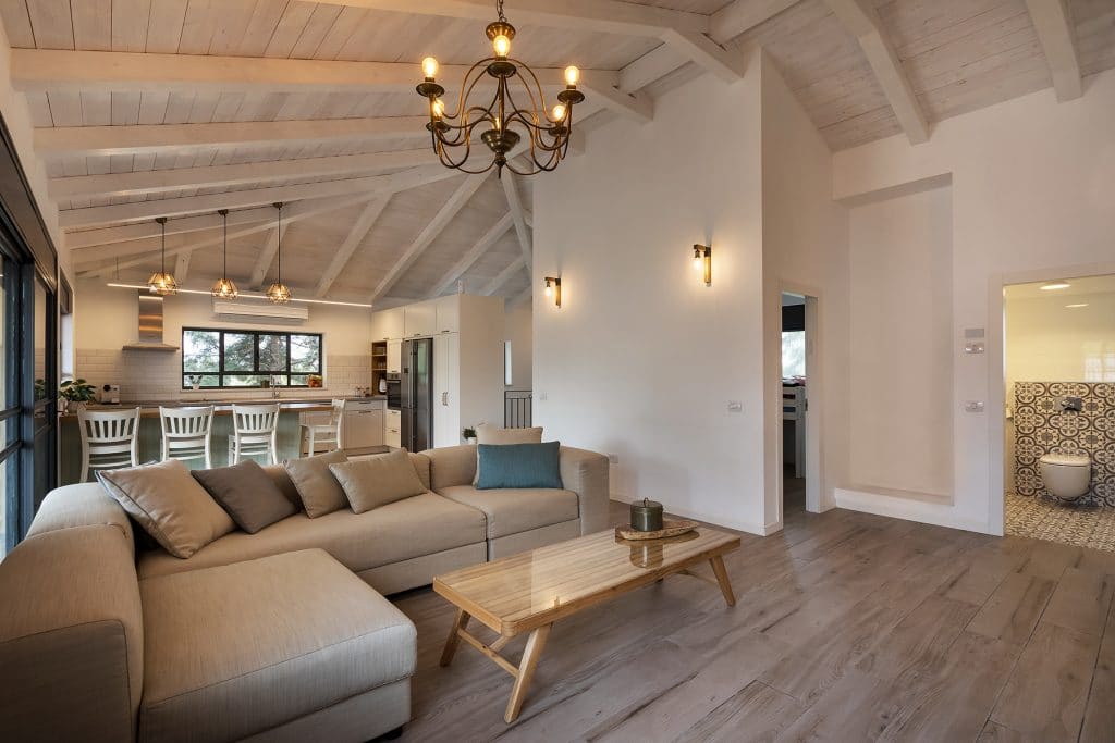 בית תעשייתי מלא חום ,עם מקום ונוכחות לחומרים טבעיים. תקרת הבטון החשופה חולשת על כל תקרת קומת הקרקע ומובילה אל גן פרטי. תקרת סקיילייט מחדירה אור טבעי אל גרם המדרגות. מטבח עץ מלא נוכחות ותעלת מיזוג אוויר גלויה. חומרי הגמר : טיח לבן , תקרת בטון חשוף.