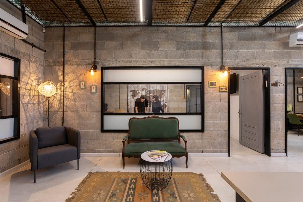 מתחם משרדי אדריכלים בלב אזור תעשייה פעיל ורועש . עיצוב המשרד מנציח את סביבת התעשייה הקרובה בכל תחום המשרדים : קירות בלוק חשוף , תקרות רשת גלויות , כבלי חשמל ותאורה חשופים, מפסקים ושקעים גלויים.